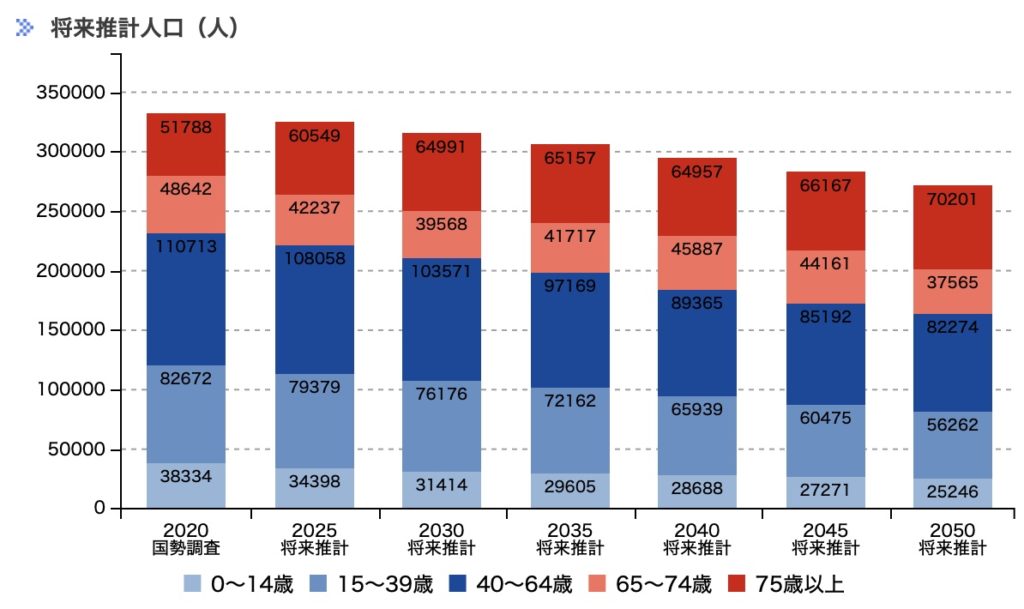 将来推計人口をみると、2050年には271,548人まで減少すると予想されており、高齢化率予想は39.69%と、40%近い高齢化率に達する見込みです。