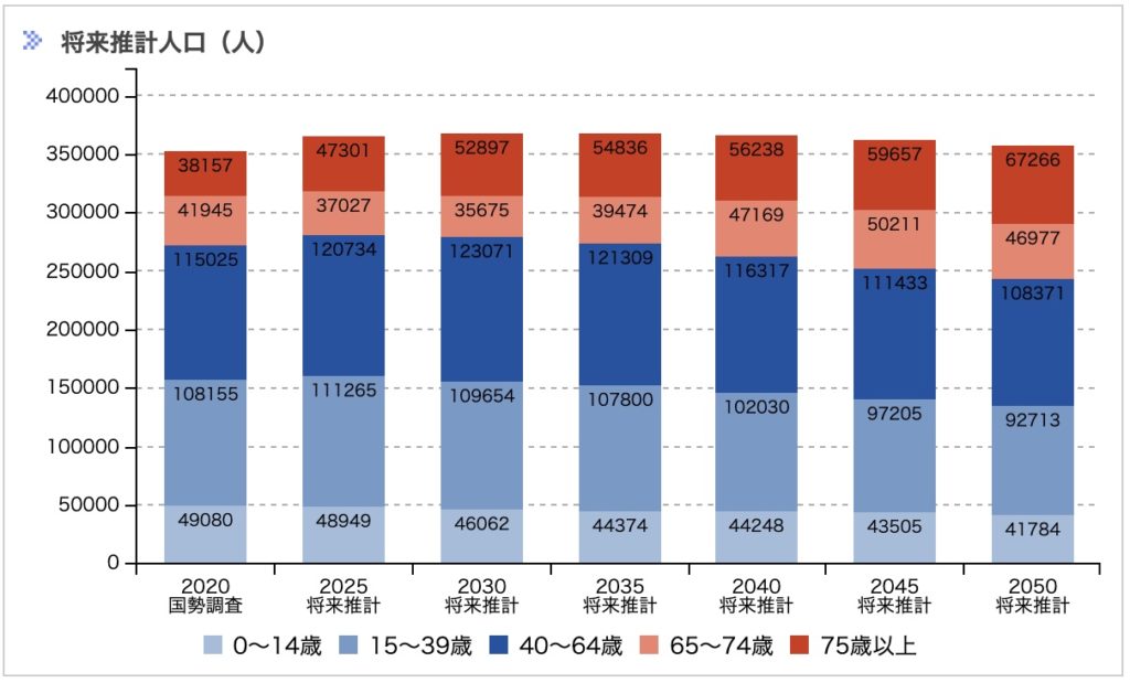 2020年時点での人口は332,149人、高齢化率は30.20%と、全国平均の28.6%をわずかに上回っておりますが、おおむね全国平均と同等ということが分かります。